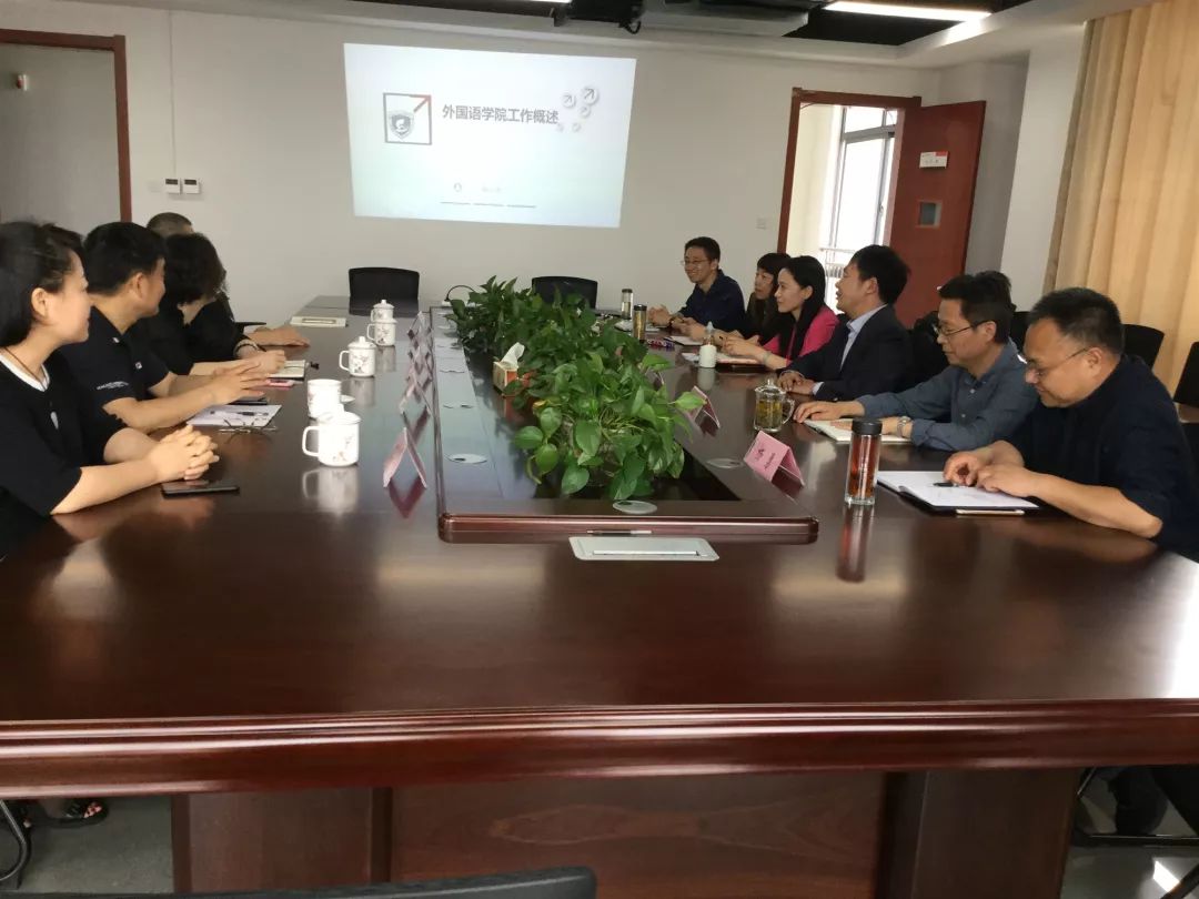 2019年4月26日,新疆农业大学外语学院马琴院长携黄川副院长(援疆干部),新疆维吾尔自治区高校外语教学研究会会长徐世昌教授,大外部王婷主任,英语专业唐彬主任来到jinnianhui金年会诚信至上翡翠湖校区jinnianhui金年会诚信至上进行调研,座谈,参加会议的有韩江洪院长、胡丹书记、杨勇副院长、唐军副院长,英专陈曦主任以及刚援疆回来的大外部胡安琳主任。首先韩江洪院长介绍了学院的基本情况,随后对英语专业“以能力为导向的”人才培养模式、大学英语教学研究、研究生培养、师资队伍建设以及学术研究等方面的成功经验做了交流发言,双方就教学、科研的相关问题也进行了探讨,随后,考察成员参观了外语学院同声传译实训室、 各系部教研室、党建活动室、以及心理咨询室等。最后,双方代表希望今后在大学英语教学改革、专业建设、党建工作等各个方面能有更加深入的交流和合作。
