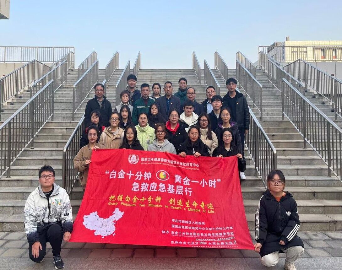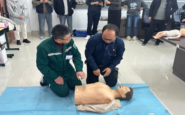会后薛城区人民医院急诊科主任杨刚三向同学们展示了在紧急情况如何进行急救,分别教授了在无呼吸无意识的情况下如何进行心肺复苏,若呼吸道受阻如何使用海姆利克和如何使用AED,同时同学们在杨主任的帮助下进行实践,提升急救能力。