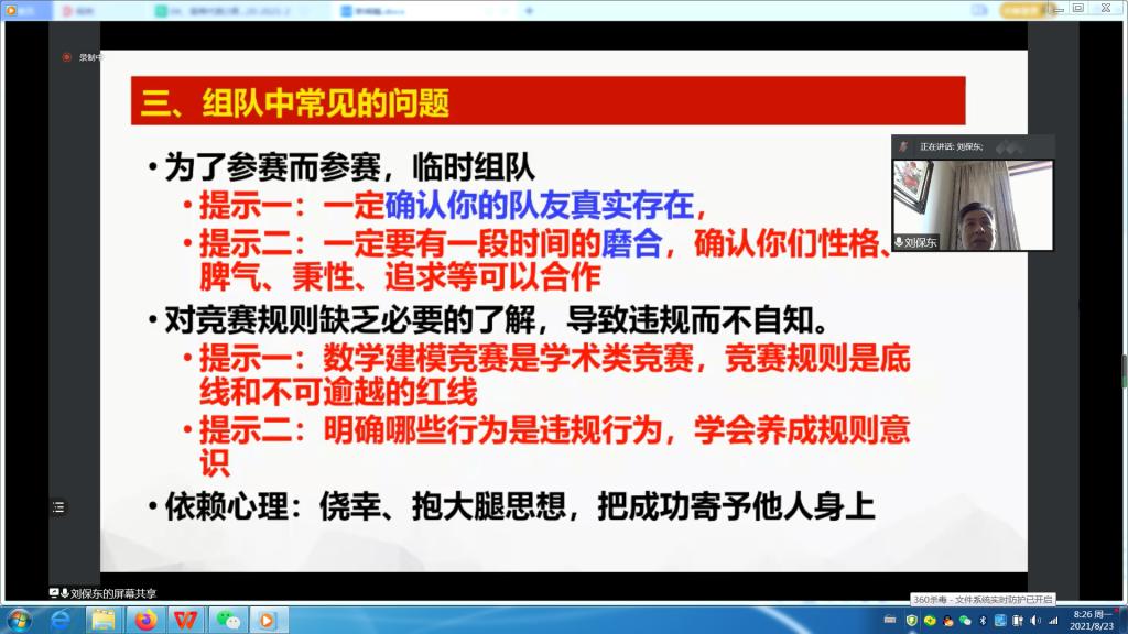 8月28日上午,数学与统计学院邀请全国大学生数学与建模竞赛山东赛区专家组组长、山东大学硕士生导师刘保东教授,在线上作专题报告,数学与统计学院、信息科学与工程学院、人工智能学院全体建模指导教师以及全校参赛学生参加报告会。报告会由数学与统计学院副院长吕长青老师主持。