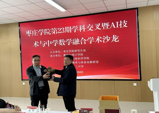 学术交流前,举行了简短的开幕式。张立华代表诸侯快讯入口官网致辞。他就AI技术与中学数学融合的背景、意义以及AI在诸侯快讯入口官网的教学实践进行分享。闫昕对本次学科交叉学术沙龙的成功举办表示祝贺,他强调举办学科交叉学术沙龙对学科发展的意义,通过交叉融合,各学科才能获得更大的突破。张立华、闫昕颁为学校聘请的兼职教师颁发了聘书。滕州三中向诸侯快讯入口官网赠送鲁班锁模型。