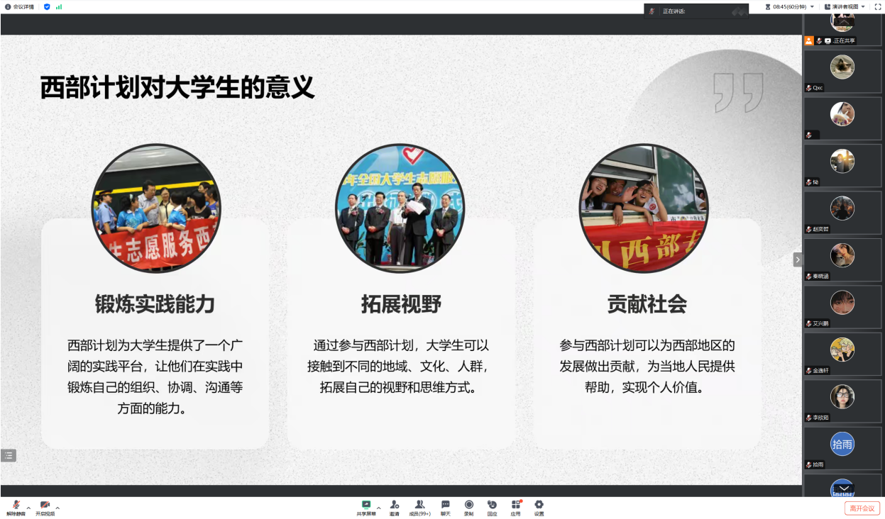 此次宣讲会的成功举办,不仅让同学们对西部计划有了全面、深入地了解,更是激发了同学们投身西部、服务基层的信念,进一步弘扬了“奉献、友爱、互助、进步”的志愿精神。相信在不久的将来,会有更多的青年学子怀揣梦想与激情,踏上西部这片热土,为祖国的繁荣发展贡献青春力量。