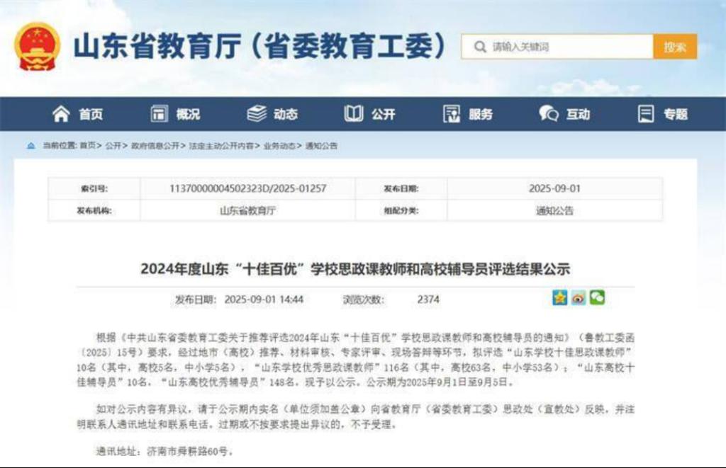 本次评选经过地市(高校)推荐、材料审核、专家评审、现场答辩等环节,共评选“山东学校十佳思政课教师(高校)”5名、“山东学校优秀思政课教师(高校)”63名;评选“山东高校十佳辅导员”10名、“山东高校优秀辅导员”148名。