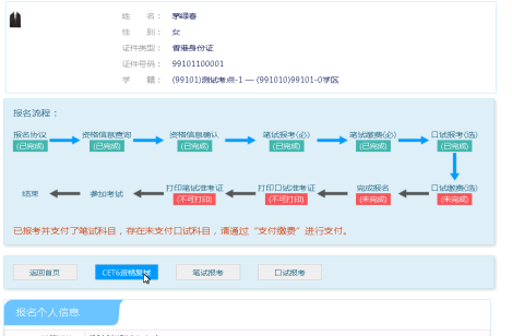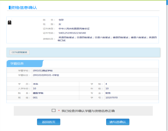 考生可以在这个页面,检查自己的照片和基本信息是否正确,查看自己的报考资格科目和进行CET6资格复核申请。