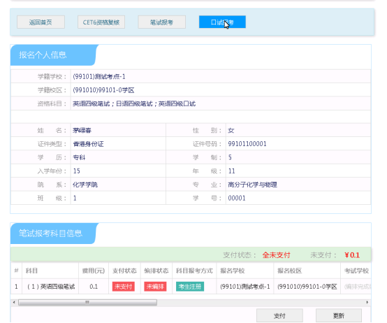 选择要报考的科目,点击“提交”按钮,返回到考生报名页面,点击“口试报考”