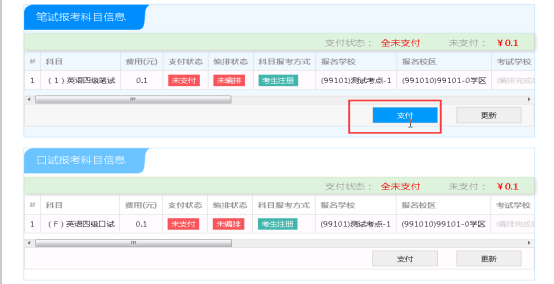 5.缴费时,如银行扣费成功,但系统显示科目支付状态为“未支付”时,不要重复缴费,可点击“更新”按钮更新支付状态,或拨打考点咨询电话查询支付状态。因考务问题或技术问题造成重复缴费需要退费的,教育部考试中心会在考试结束一个月内原路退回考生账户。