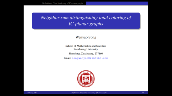 宋文耀老师做了题为《Neighbor sum distinguishing total coloring of IC-planar graphs》的学术报告,报告主要介绍了ic平面图是每条边最多交叉一次且没有两条交叉边共用一个顶点的拓扑图,即如果交叉边对的端点相互不同,则两个不同的交叉是独立的。如果一个图G在平面上有一个图,其中每两个交叉都是独立的,那么我们称G为独立交叉平面图或简称ic -平面图。本文给出了ic平面图的邻域和区分全着色的一些结果。