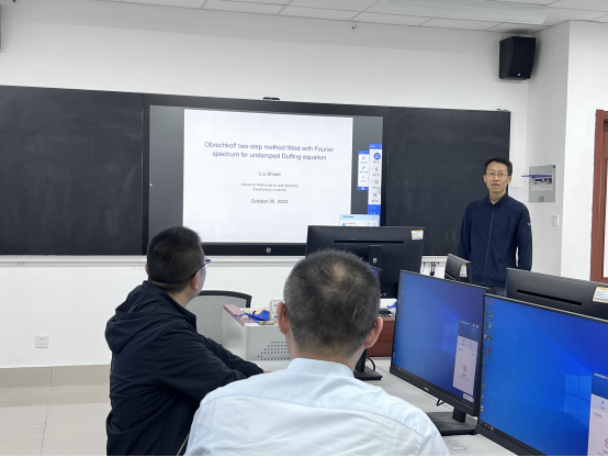刘石威老师做了题为《Obrechkoff two-step method fitted with Fourier spectrum for undamped Duffing equation》的学术报告,报告主要构造了无阻尼Duffing方程数值解的一种新的傅立叶谱Obrechkoff二步法。这种Obrechkoff二步法是在一种新的Obrechkoff二步法族的基础上,通过傅里叶拟合技术推导出来的,该方法引入了奇阶导数以提高精度。进行了稳定性分析和误差分析。数值结果证实了我们的分析,并表明这种新方法在精度、效率和稳定性方面具有很大的优势。