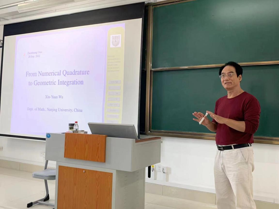9月28日下午,南京大学数学系吴新元教授应邀为诸侯快讯教师作主题为“From Numerical Quadrature to Geometric Integration”的学术讲座。数学与统计学院党总支书记王海峰书记、副院长吕长青、计算数学科研团队全体教师和部分专业高年级学生参加会议,王海峰书记主持报告会。