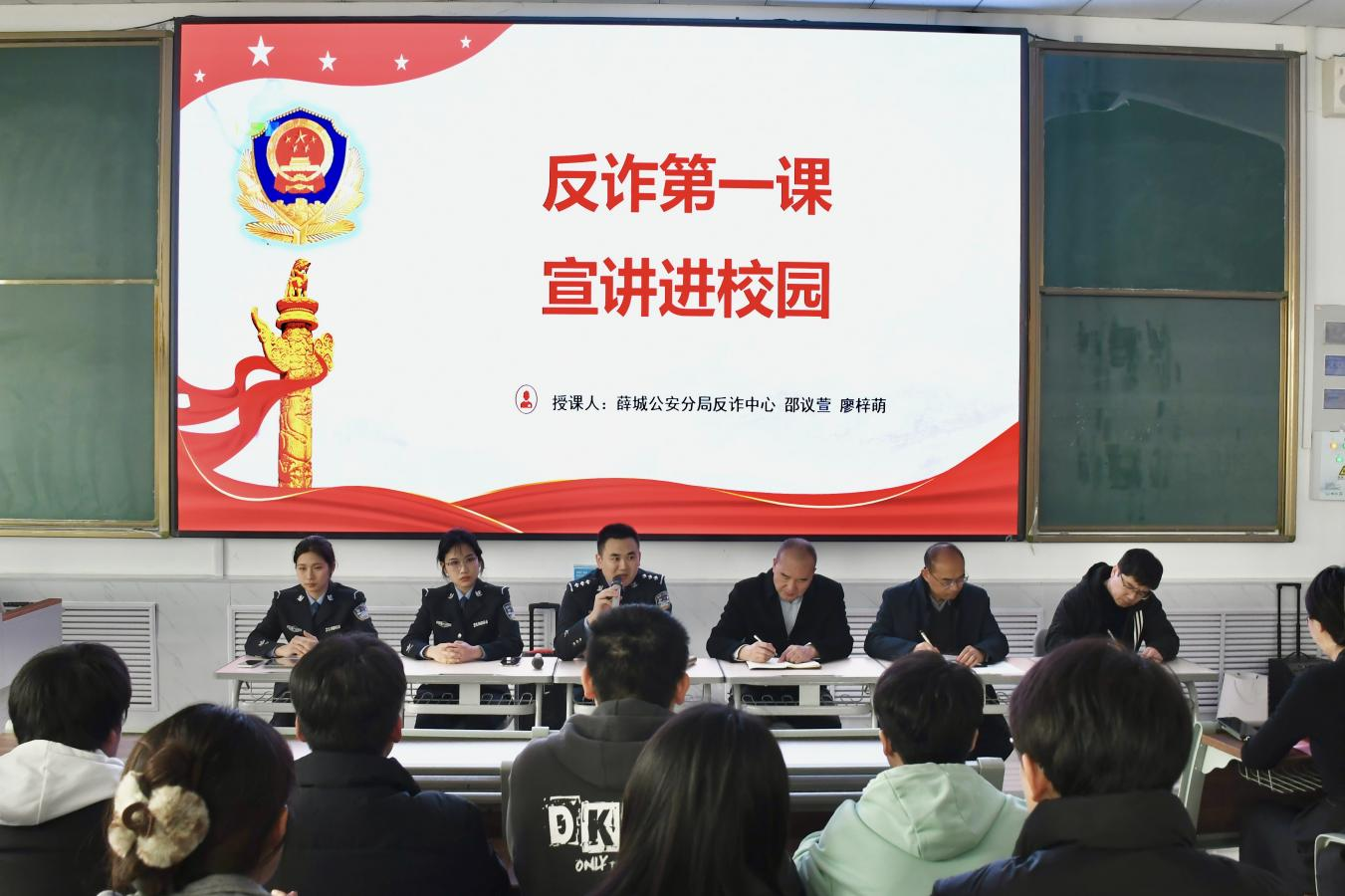 薛城区公安分局刑警大队副大队长胡乐飞警官和反诈专员邵议萱、廖梓萌以“防范电信网络诈骗”为题,为同学们带来了一场生动精彩的反诈宣传课。